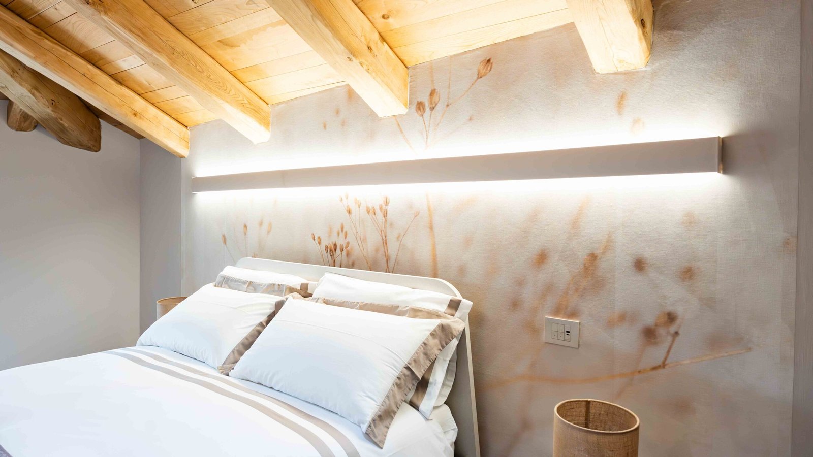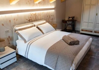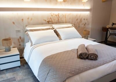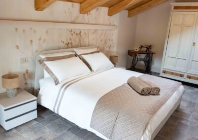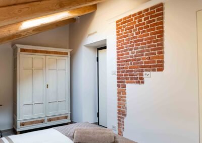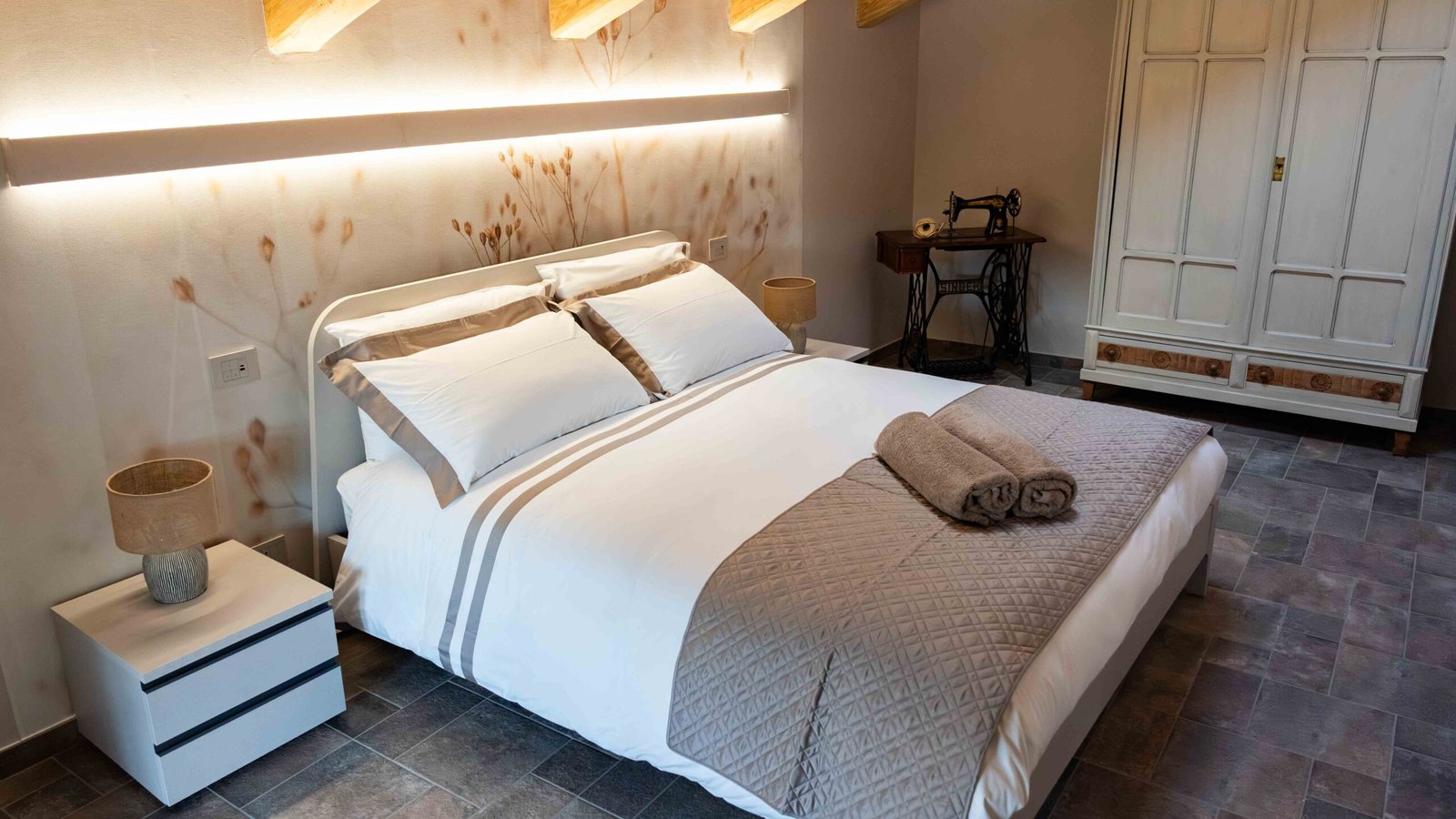 Il tema scelto per questo ambiente è il Fienile, luogo della cascina una volta destinato alla conservazione del fieno e del foraggio secco per il bestiame. La carta decorativa posizionata dietro la testiera del letto richiama i colori tenui e caldi del fieno, in perfetta sintonia con il tema scelto. Le tinte e l’arredamento si armonizzano perfettamente tra loro rendendo lo spazio luminoso ma allo stesso tempo rilassante: una perfetta bomboniera per un soggiorno di coppia. L’arredamento comprende un letto matrimoniale, due comodini, una TV, un frigo bar, una postazione caffè e un armadio con cassetta di sicurezza. Il bagno, ampio e luminoso, è completo di sanitari sospesi, doccia e mobile lavabo con specchio.