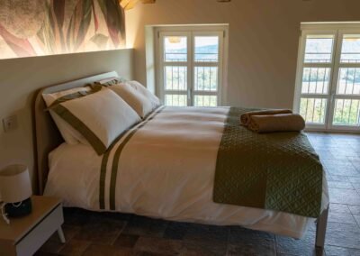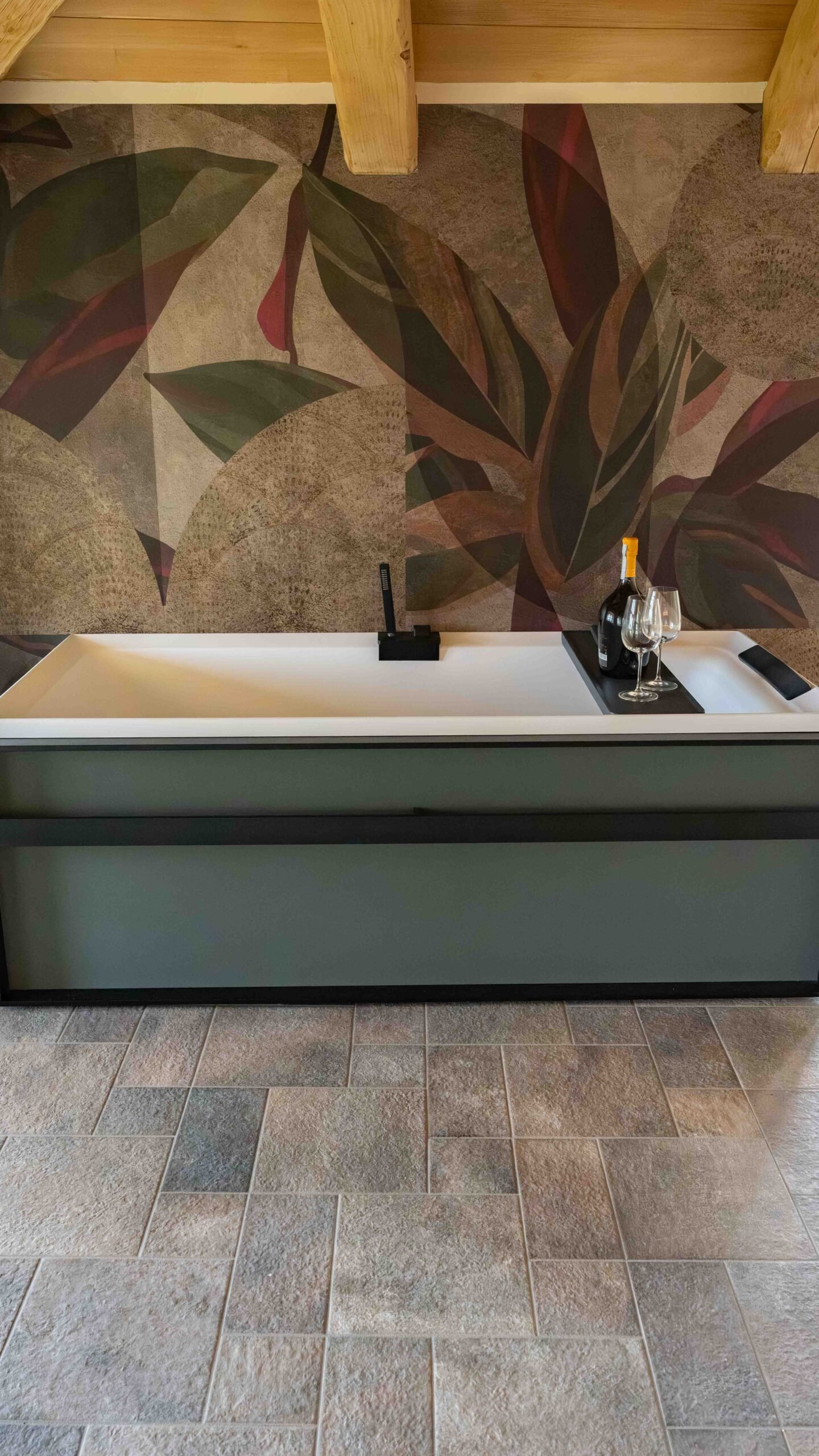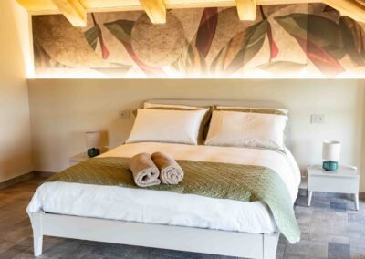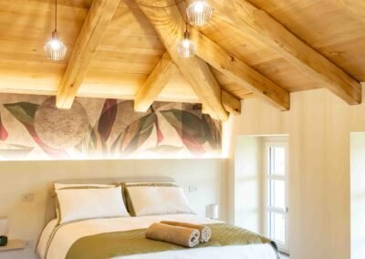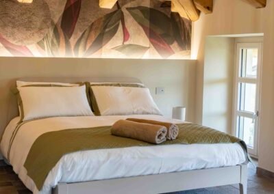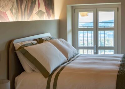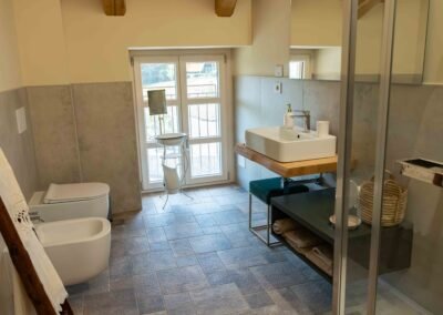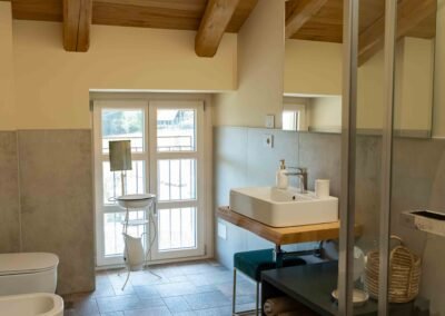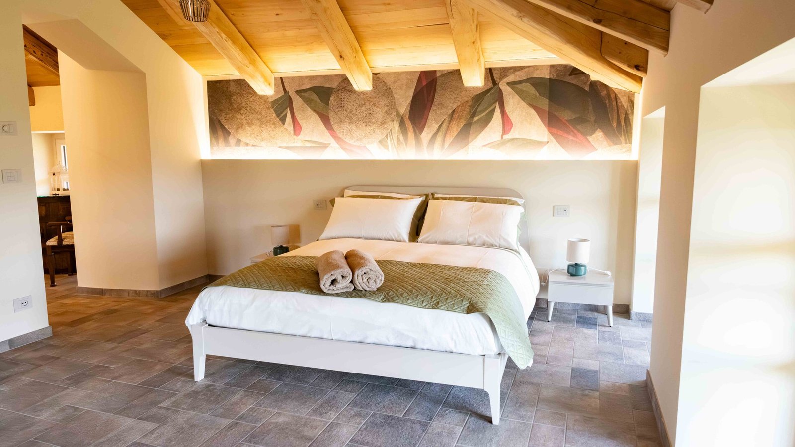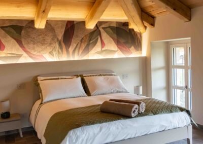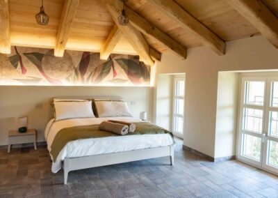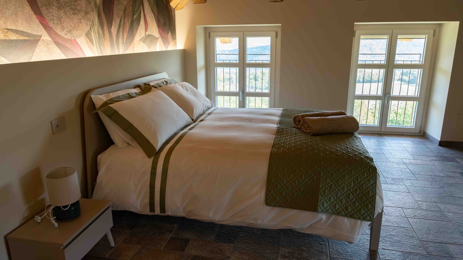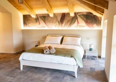 Il tema scelto è quello della Cantinetta, un tempo fulcro della cascina per la conservazione degli alimenti e luogo di festa durante la vendemmia. E’ la più spaziosa delle quattro camere e l’unica con la vista sui laghi. Offre, inoltre, la possibilità (su richiesta) di inserire un letto aggiuntivo diventando un’eventuale camera tripla. I colori di questo ambiente richiamano quelli presenti nell’antica cantina e spaziano dal verde bottiglia delle damigiane al viola dell’uva matura e sono in perfetta armonia con il panorama circostante. L’arredamento è studiato nei minimi dettagli per far sì che la tradizione e la modernità possano coesistere e dare vita ad un ambiente elegante e unico nel suo genere. Il letto matrimoniale, situato in posizione strategica, gode della vista sul panorama circostante e sulla vasca idromassaggio posizionata sulla parete opposta anch’essa con affaccio sul lago grande di Avigliana. Completano il tutto un armadio, due comodini, una TV, un frigo bar, una cassetta di sicurezza e una postazione caffè. Il bagno è preceduto dall’ anti-bagno ed è completato da sanitari sospesi, mobile lavabo con specchio e ampia doccia.