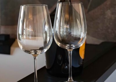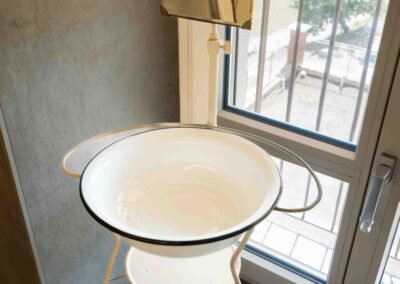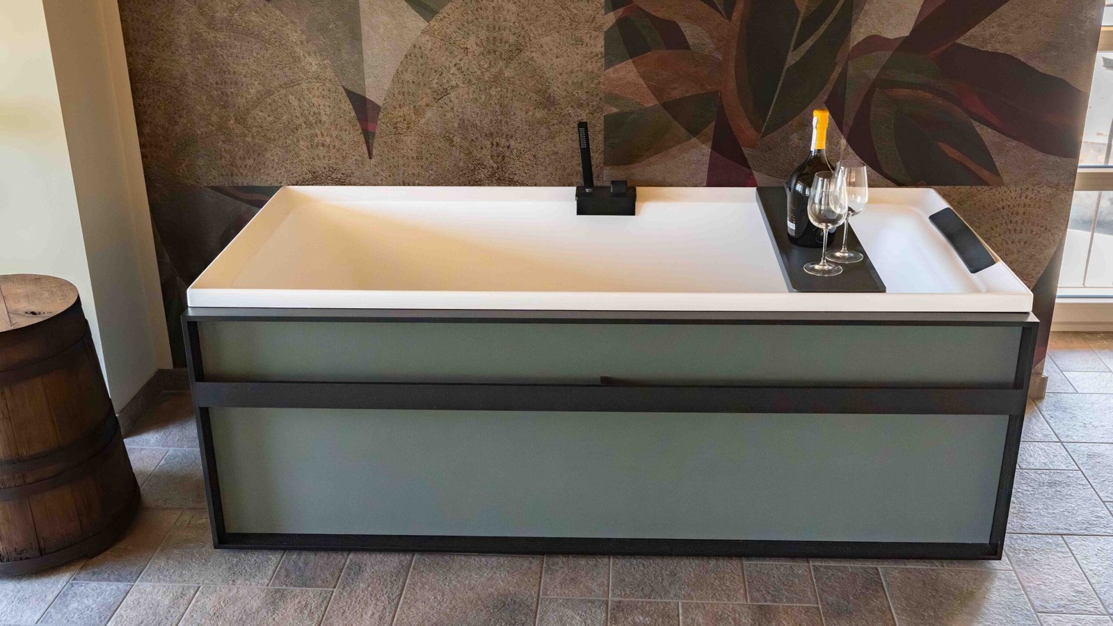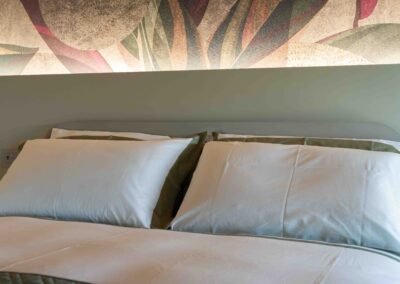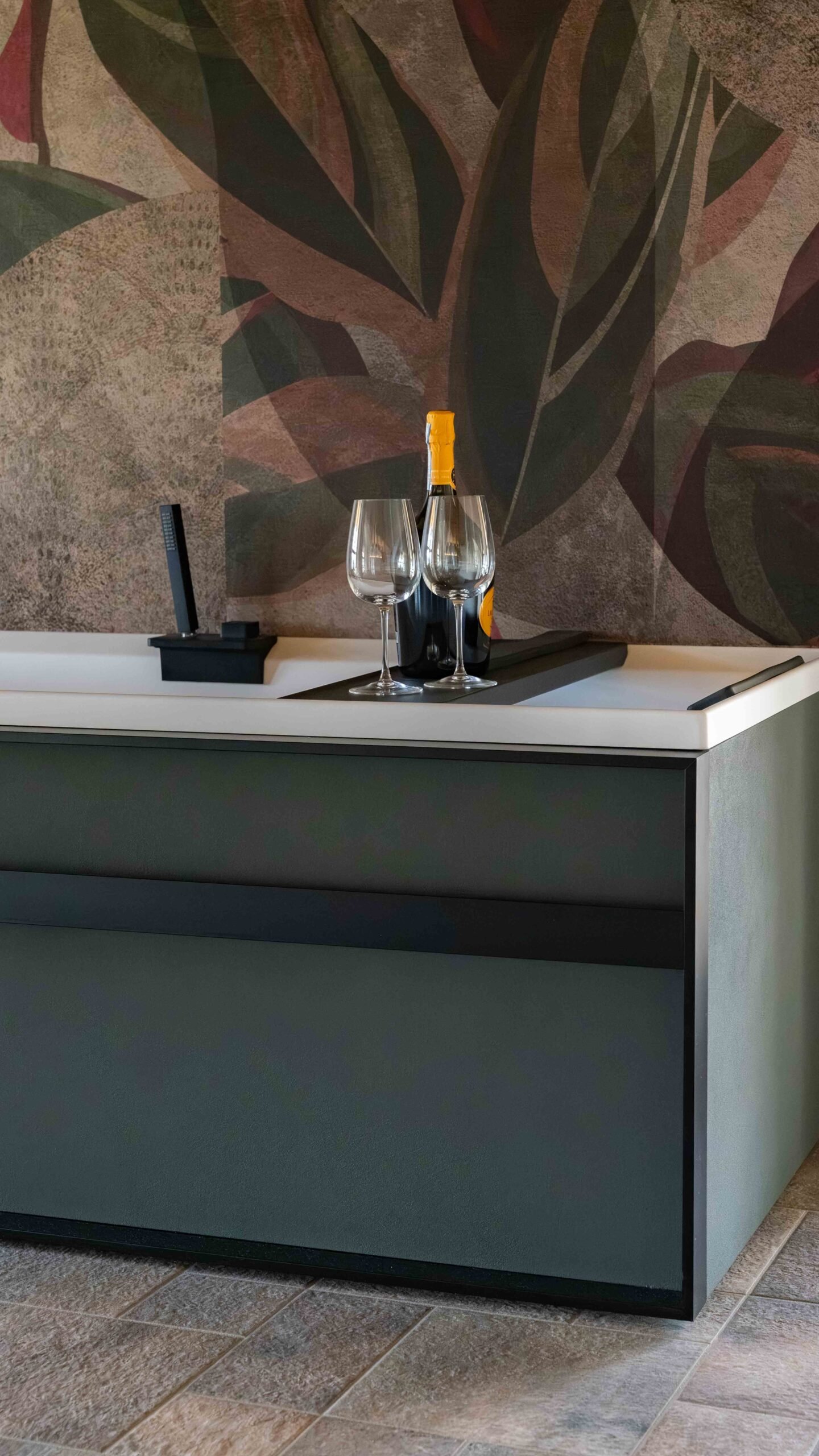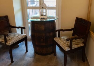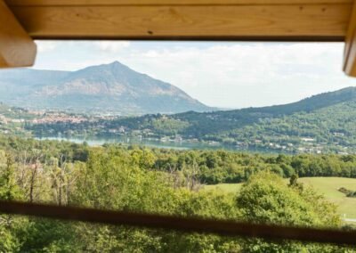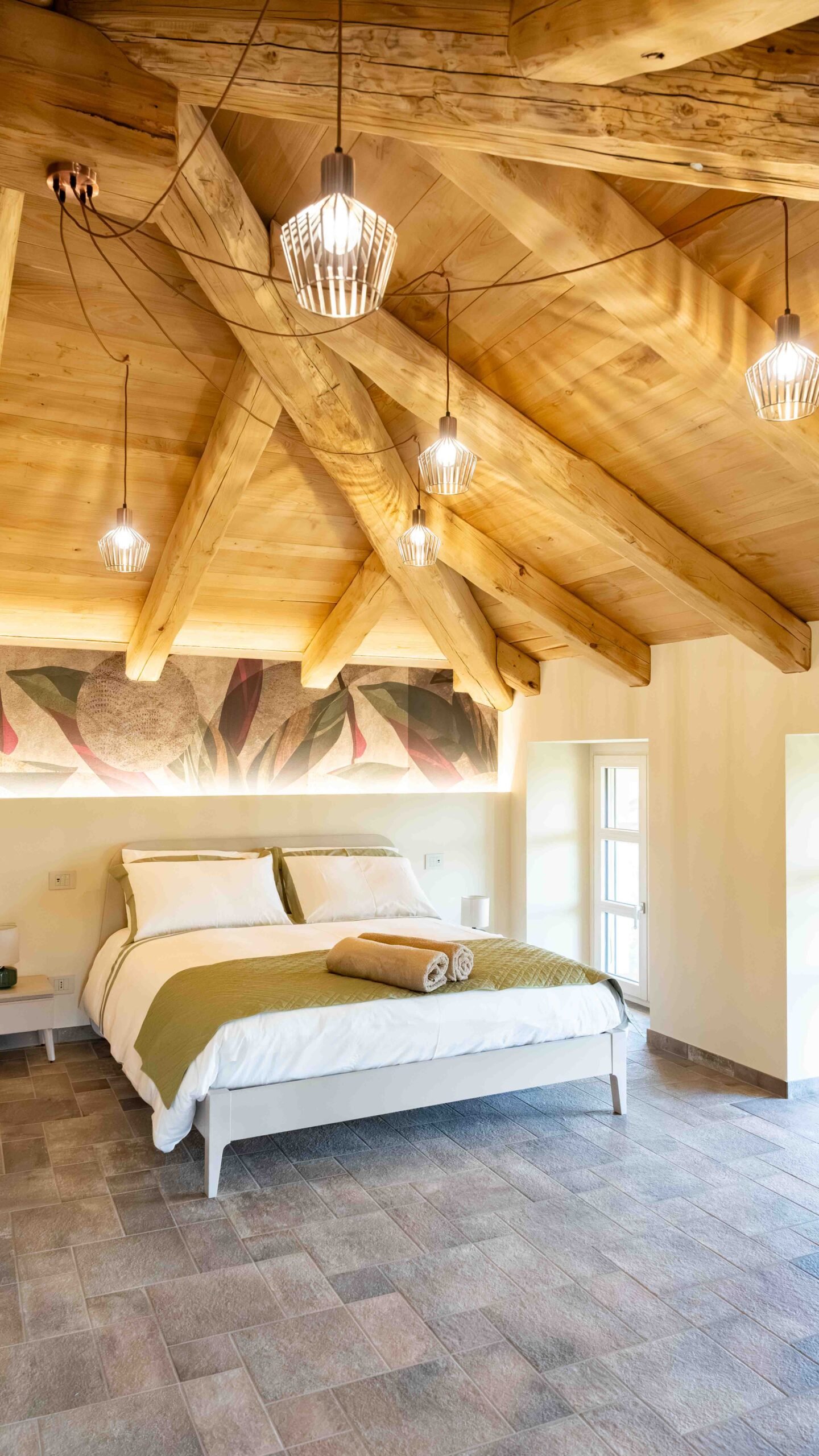Il tema scelto è quello della Cantinetta, un tempo fulcro della cascina per la conservazione degli alimenti e luogo di festa durante la vendemmia. E’ la più spaziosa delle quattro camere e l’unica con la vista sui laghi. Offre, inoltre, la possibilità (su richiesta) di inserire un letto aggiuntivo diventando un’eventuale camera tripla. I colori di questo ambiente richiamano quelli presenti nell’antica cantina e spaziano dal verde bottiglia delle damigiane al viola dell’uva matura e sono in perfetta armonia con il panorama circostante. L’arredamento è studiato nei minimi dettagli per far sì che la tradizione e la modernità possano coesistere e dare vita ad un ambiente elegante e unico nel suo genere. Il letto matrimoniale, situato in posizione strategica, gode della vista sul panorama circostante e sulla vasca idromassaggio posizionata sulla parete opposta anch’essa con affaccio sul lago grande di Avigliana. Completano il tutto un armadio, due comodini, una TV, un frigo bar, una cassetta di sicurezza e una postazione caffè. Il bagno è preceduto dall’ anti-bagno ed è completato da sanitari sospesi, mobile lavabo con specchio e ampia doccia.
